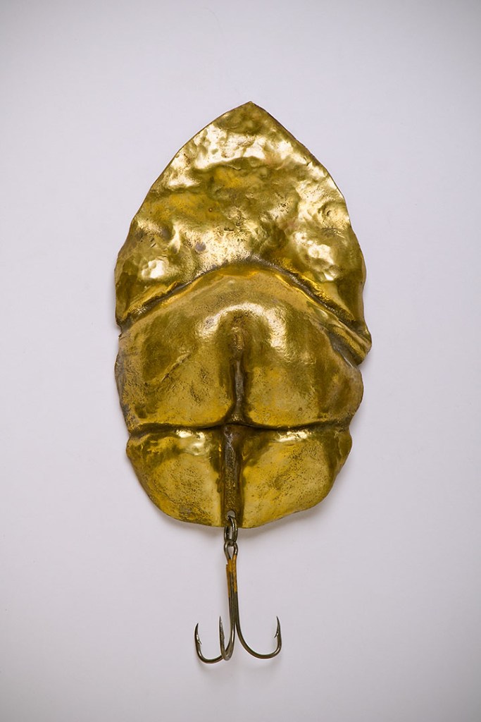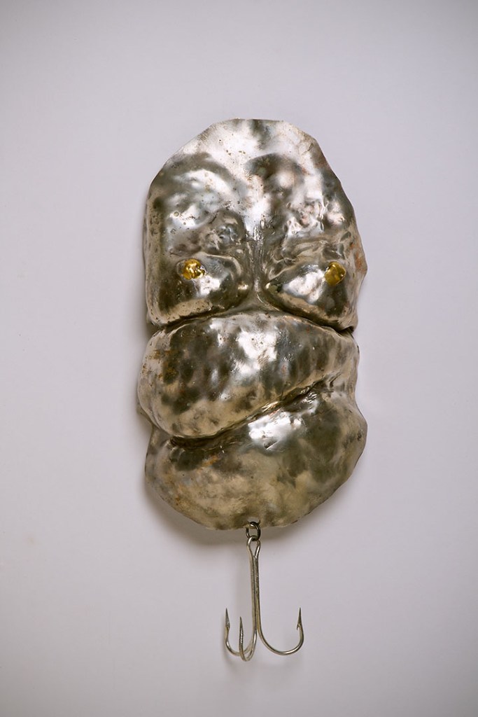 Bait #2, Chased nickel with brass and found object, 6.5″ x 14″